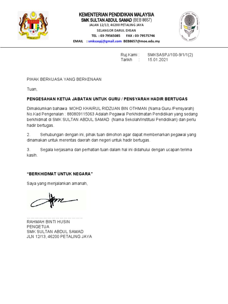 Surat Pengesahan Ketua Jabatan Hadir Bertugas Pdf